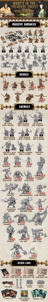 La nouvelle campagne KS CMON / Guillotine Games vient de commencer avec Massive Darkness, un jeu qui fleure bon le Dungeon Crawler avec une forte connotation Rackham / Confrontation dans l\’esthétique des Héros et Monstres qui viendront peupler les donjons.