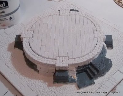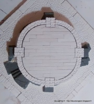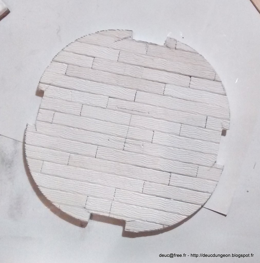 Les encoches pour la base des piliers ont été creusés et limés dans le plancher de façon à ce qu\’il puisse s\’encastrer dans la base de la tour. Le niveau du plancher a été ajusté avec quelques chutes de MDF 3 mm d\’épaisseur. Il restera encore à faire les jointures une fois que l\’ensemble aura séché.